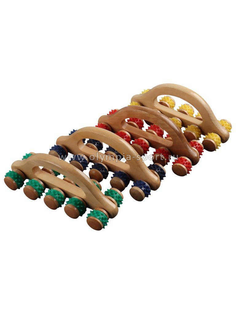 Массажёр деревянный гусеница с ручкой пластик (10 колес, 18*6*7см) OT